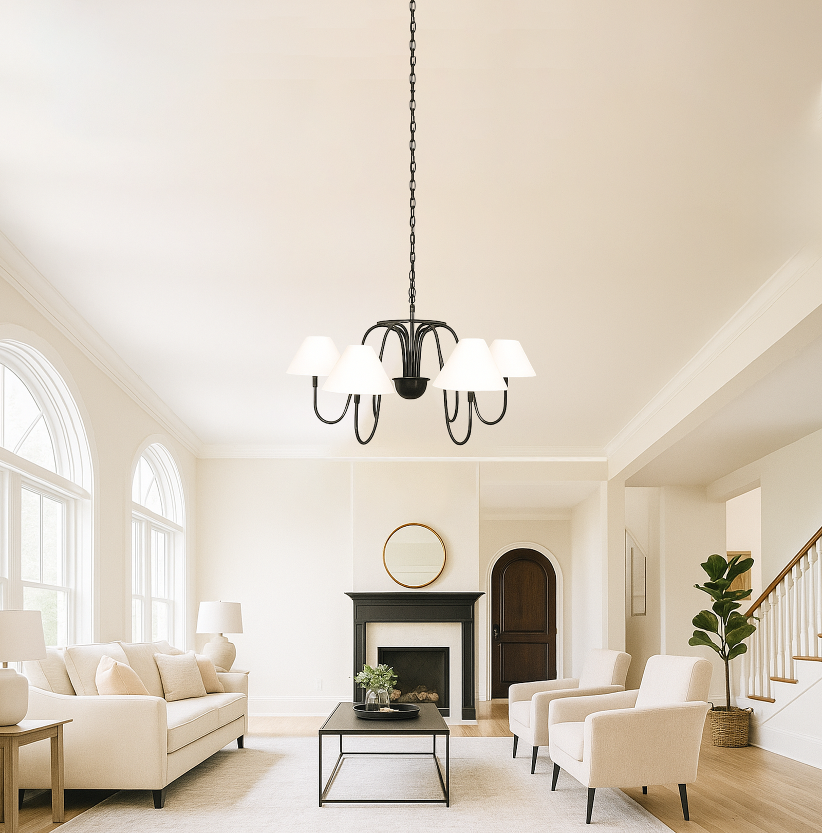 <h3 style="box-sizing: border-box; margin: 0px 0px 20px; line-height: 1.5em; font-size: 17px; font-family: "Open Sans", sans-serif; padding: 0px; color: rgb(40, 40, 40); background-color: rgb(255, 255, 255);"><span style="box-sizing: border-box; font-family: Inter, sans-serif, Zen; font-size: 18px; white-space-collapse: preserve-breaks; background-color: rgb(244, 245, 246);">Illuminate your space with this stunning Black chandelier featuring five elegant white shades. The vibrant red finish adds a bold touch to any room, while the soft white shades diffuse light beautifully, creating a warm and inviting atmosphere. Perfect for dining rooms, living areas, or entryways, this chandelier combines modern design with classic charm, making it a versatile addition to your home decor. Elevate your interior style and enjoy the perfect blend of color and light with this exquisite lighting fixture.</span></h3>