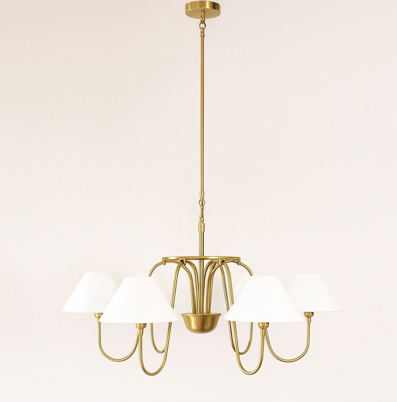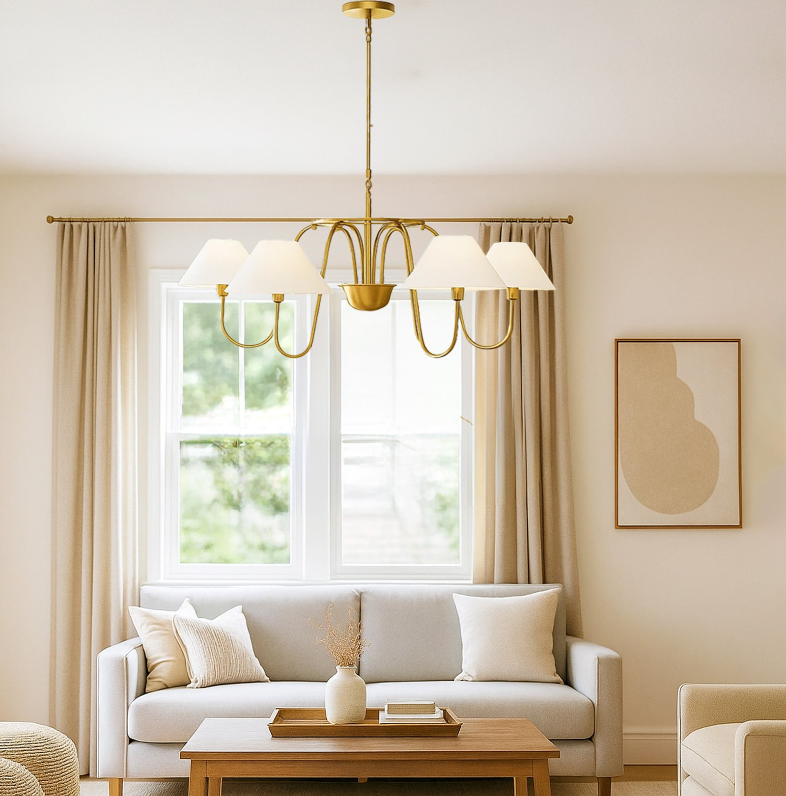 <h3 style="box-sizing: border-box; margin: 0px 0px 20px; line-height: 1.5em; font-size: 17px; font-family: "Open Sans", sans-serif; padding: 0px; color: rgb(40, 40, 40); background-color: rgb(255, 255, 255);"><span style="box-sizing: border-box; font-family: Inter, sans-serif, Zen; font-size: 18px; white-space-collapse: preserve-breaks; background-color: rgb(244, 245, 246);">Illuminate your space with this stunning Golden chandelier featuring five elegant white shades. The vibrant red finish adds a bold touch to any room, while the soft white shades diffuse light beautifully, creating a warm and inviting atmosphere. Perfect for dining rooms, living areas, or entryways, this chandelier combines modern design with classic charm, making it a versatile addition to your home decor. Elevate your interior style and enjoy the perfect blend of color and light with this exquisite lighting fixture.</span></h3>