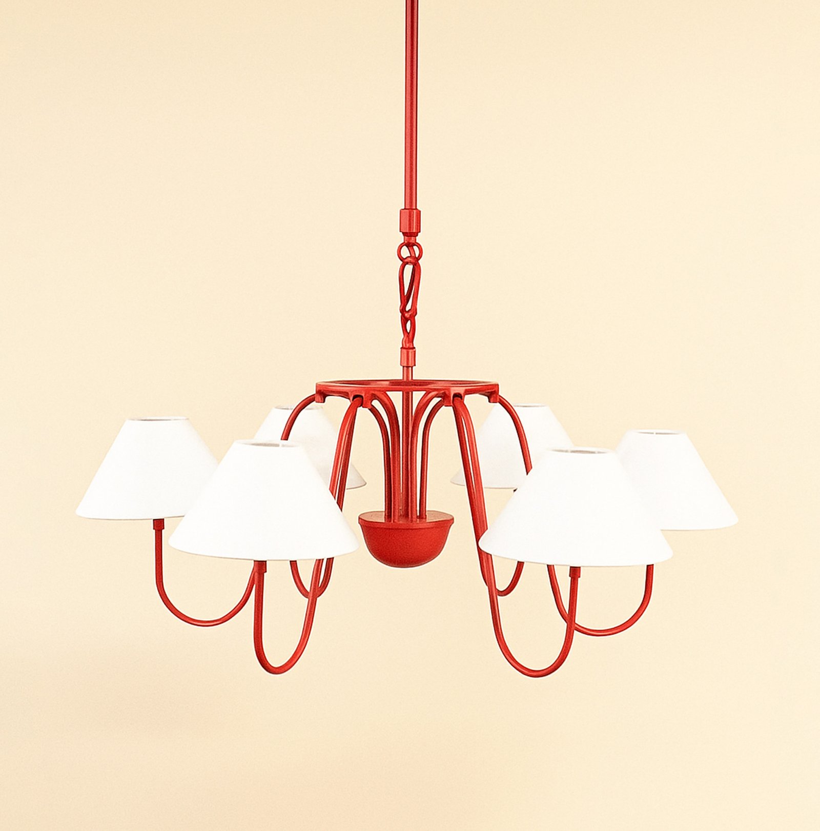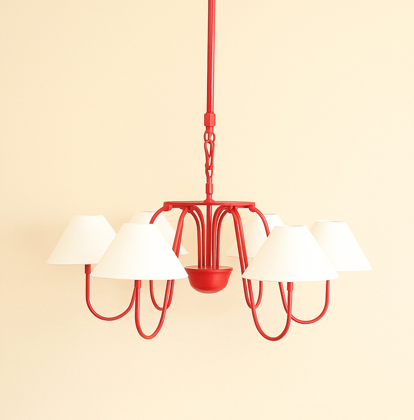 <h1 style="box-sizing: border-box; margin: 0px 0px 45px; line-height: 1.2em; font-size: 30px; font-family: "Open Sans", sans-serif; position: relative; z-index: 1; padding: 0px; color: rgb(40, 40, 40); background-color: rgb(255, 255, 255);"><span style="background-color: rgb(244, 245, 246); font-family: Inter, sans-serif, Zen; font-size: 18px; white-space-collapse: preserve-breaks;">Illuminate your space with this stunning red chandelier featuring five elegant white shades. The vibrant red finish adds a bold touch to any room, while the soft white shades diffuse light beautifully, creating a warm and inviting atmosphere. Perfect for dining rooms, living areas, or entryways, this chandelier combines modern design with classic charm, making it a versatile addition to your home decor. Elevate your interior style and enjoy the perfect blend of color and light with this exquisite lighting fixture.</span></h1>