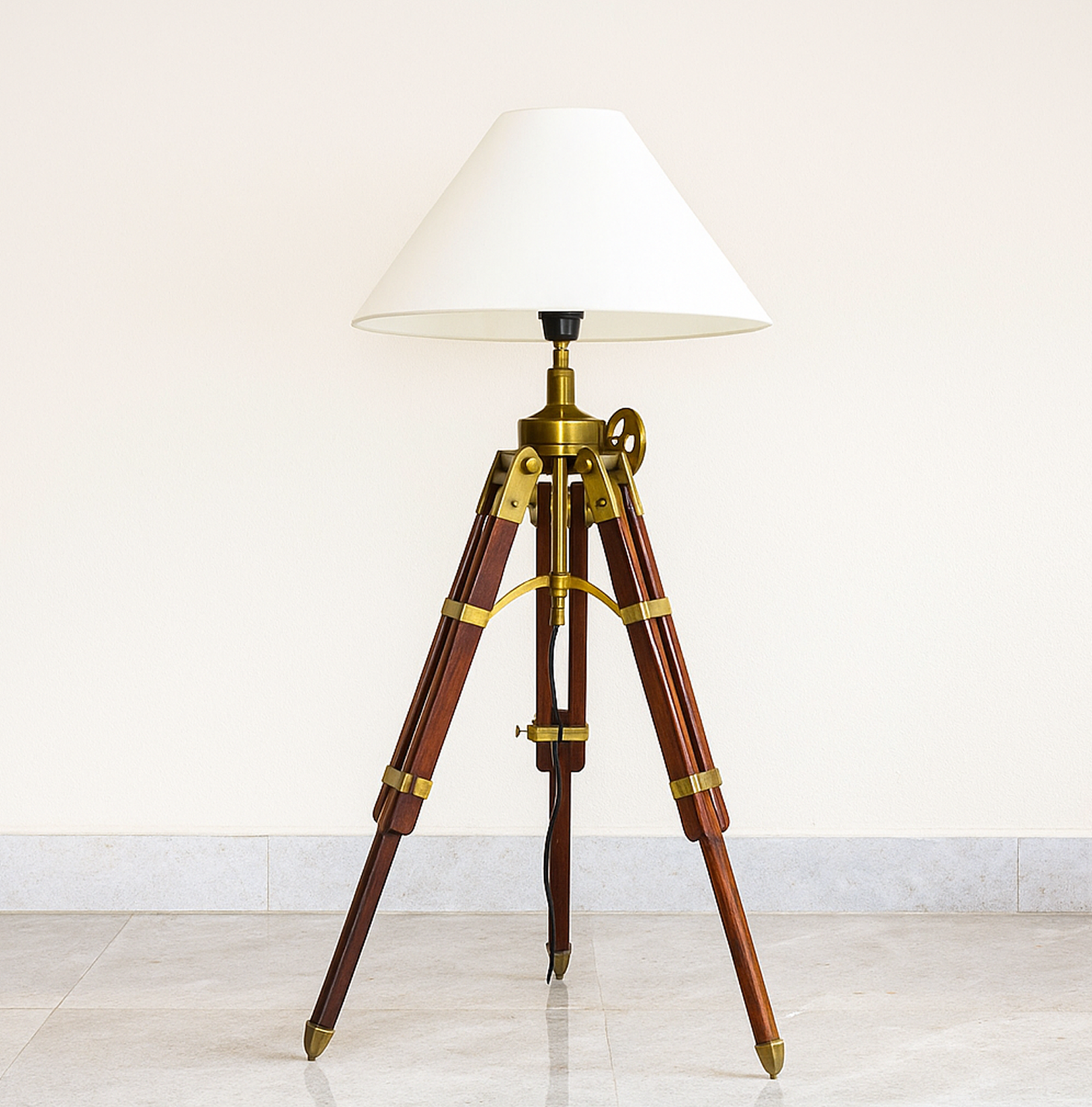 Sheesham Wood Tripod Table Lamp: Antique Brass Finish Brass Golden