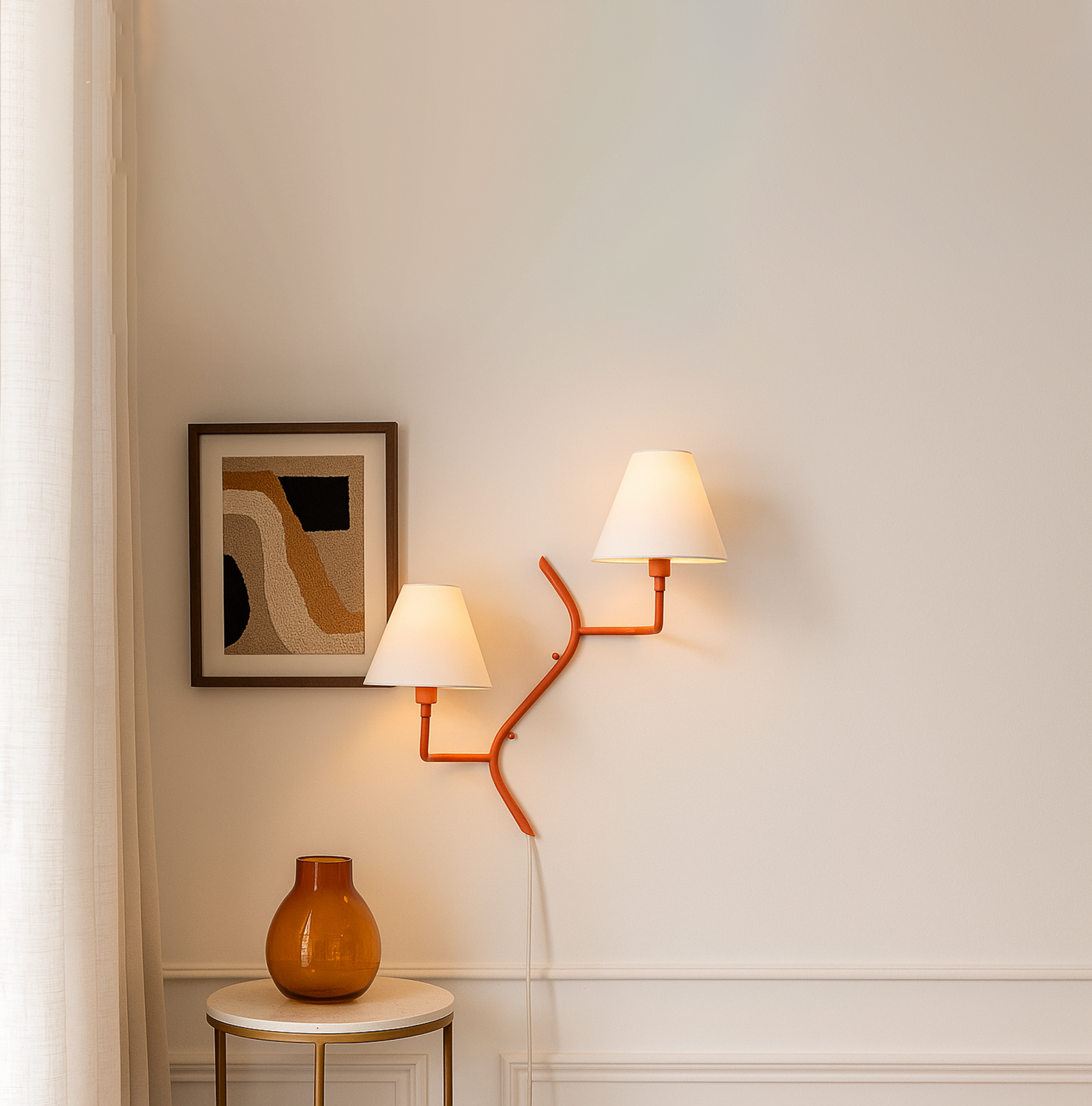 <h3 style="box-sizing: border-box; margin: 0px 0px 20px; line-height: 1.5em; font-size: 17px; font-family: "Open Sans", sans-serif; padding: 0px; color: rgb(40, 40, 40); background-color: rgb(255, 255, 255);"><span style="box-sizing: border-box;">Introducing our exquisite wall lamp, a stunning addition to your home decor. With its sleek red color finish, this lamp exudes a sense of contemporary elegance that will enhance any space. The striking design, reminiscent of a delicate two branches, adds a touch of nature-inspired beauty to your walls. Its unique shape, gives it a charming and playful aesthetic that will surely catch the eye of your guests.</span></h3>