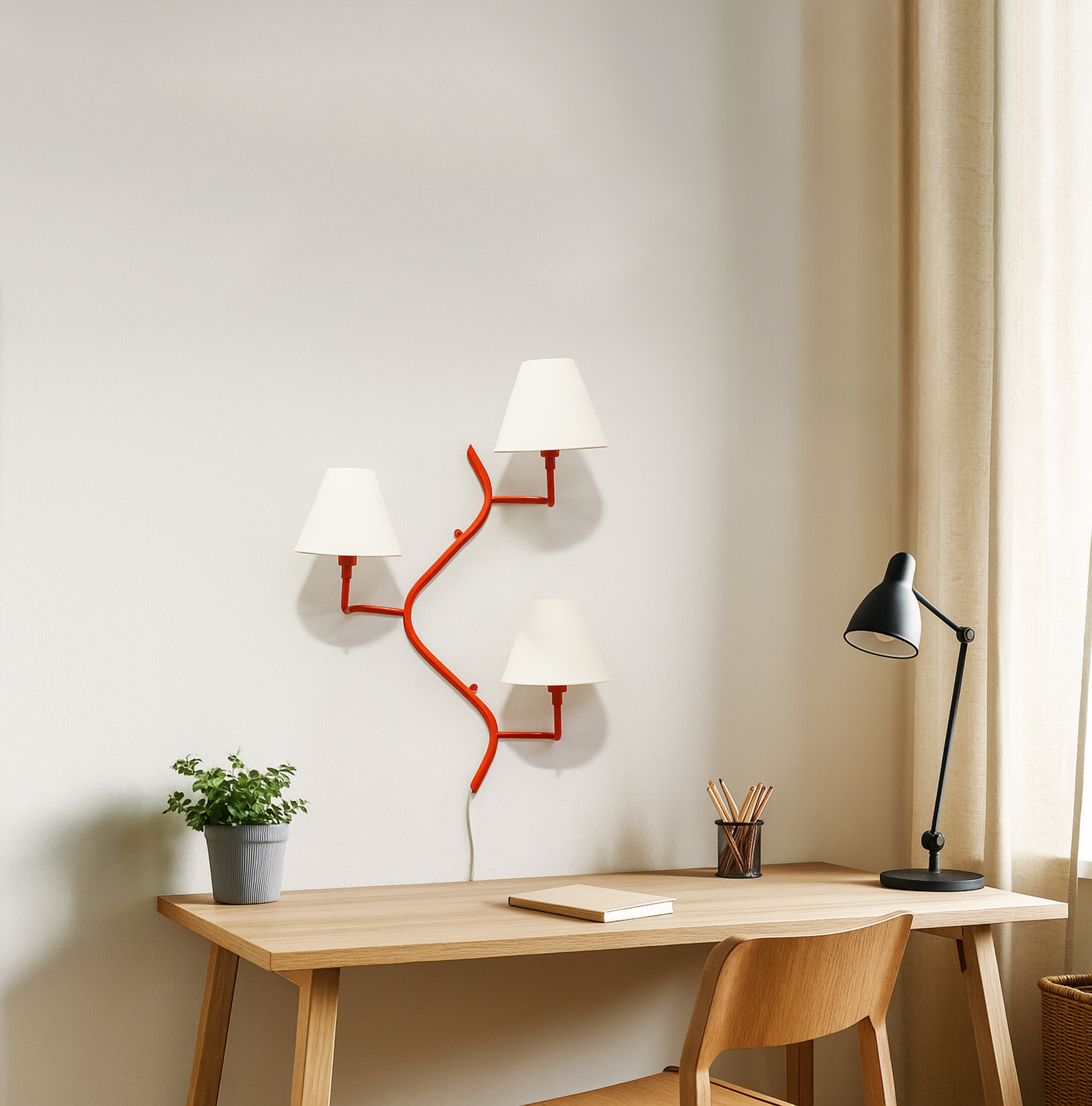<h3 style="box-sizing: border-box; margin: 0px 0px 20px; font-weight: normal; line-height: 1.2em; font-size: 17px; font-family: sans-serif, Arial, Verdana, "Trebuchet MS"; padding: 0px; color: rgb(51, 51, 51); background-color: rgb(255, 255, 255);">Introducing our exquisite wall lamp, a stunning addition to your home decor. With its sleek red color finish, this lamp exudes a sense of contemporary elegance that will enhance any space. The striking design, reminiscent of a delicate one branch design, adds a touch of nature-inspired beauty to your walls. Its unique shape, gives it a charming and playful aesthetic that will surely catch the eye of your guests.</h3>