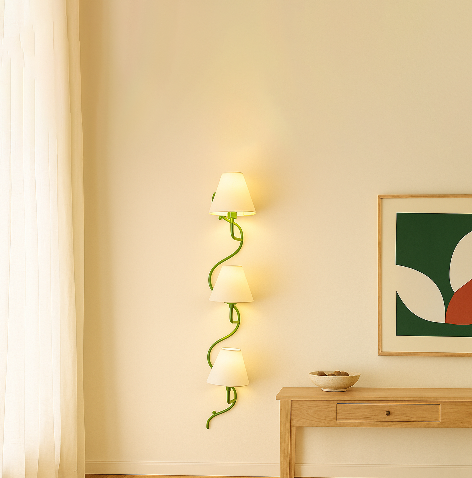 <h3 style="box-sizing: border-box; margin: 0px 0px 20px; font-weight: normal; line-height: 1.2em; font-size: 17px; font-family: sans-serif, Arial, Verdana, "Trebuchet MS"; padding: 0px; color: rgb(51, 51, 51); background-color: rgb(255, 255, 255);">Introducing our exquisite wall lamp, a stunning addition to your home decor. With its sleek green color finish, this lamp exudes a sense of contemporary elegance that will enhance any space. The striking design, reminiscent of a delicate one branch design, adds a touch of nature-inspired beauty to your walls. Its unique shape, gives it a charming and playful aesthetic that will surely catch the eye of your guests.</h3>
