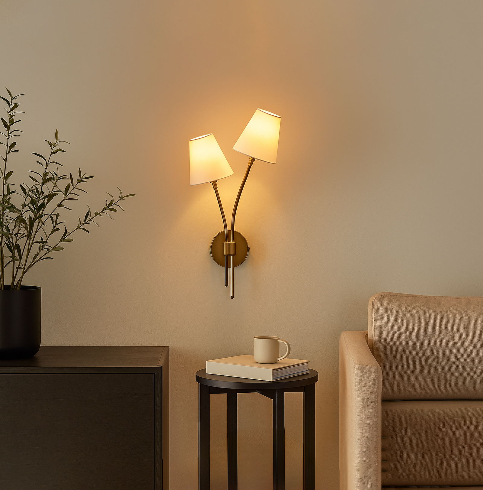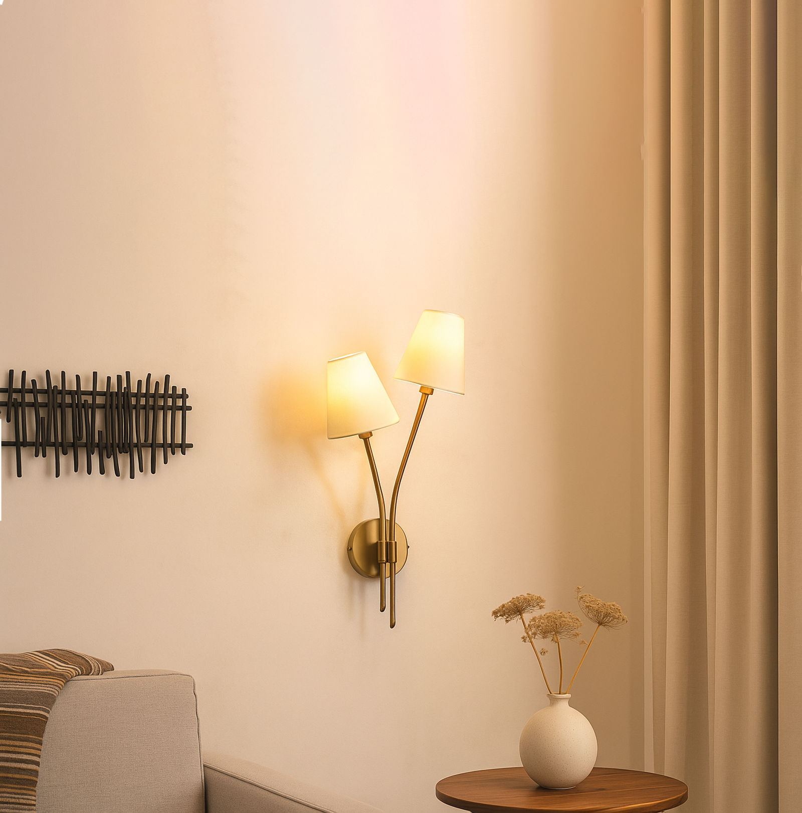 <h3 style="font-weight: normal; line-height: 1.2em; color: rgb(51, 51, 51); font-family: sans-serif, Arial, Verdana, "Trebuchet MS";">Introducing our exquisite wall lamp, a stunning addition to your home decor. With its sleek Golden color finish, this lamp exudes a sense of contemporary elegance that will enhance any space. The striking design, reminiscent of a delicate two branches, adds a touch of nature-inspired beauty to your walls. Its unique shape, gives it a charming and playful aesthetic that will surely catch the eye of your guests.</h3>