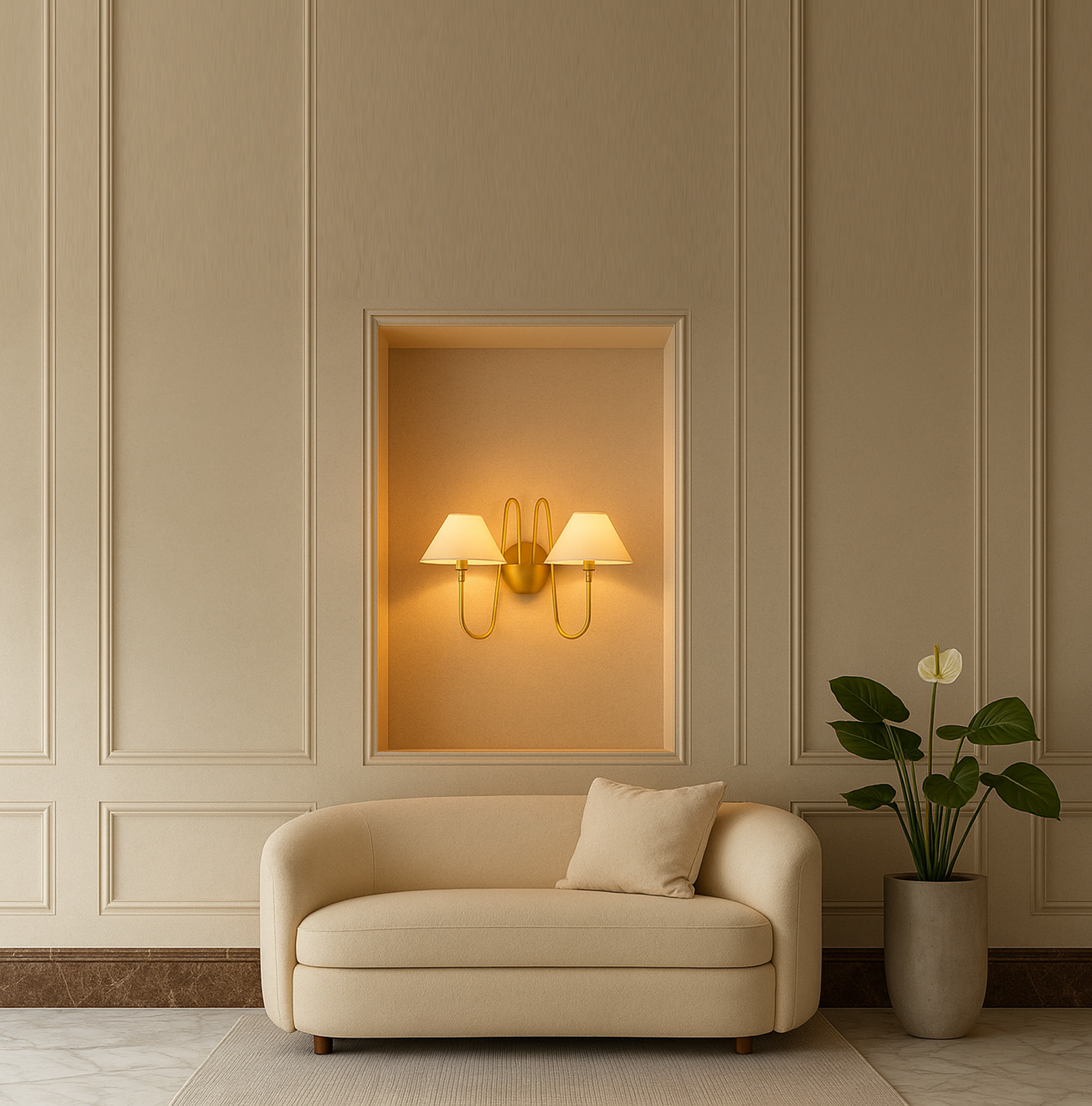 <h3 style="font-weight: normal; line-height: 1.2em; color: rgb(51, 51, 51); font-family: sans-serif, Arial, Verdana, "Trebuchet MS";">Introducing our exquisite wall lamp, a stunning addition to your home decor. With its sleek Golden color finish, this lamp exudes a sense of contemporary elegance that will enhance any space. The striking design, reminiscent of a delicate two branches, adds a touch of nature-inspired beauty to your walls. Its unique shape, gives it a charming and playful aesthetic that will surely catch the eye of your guests.</h3>