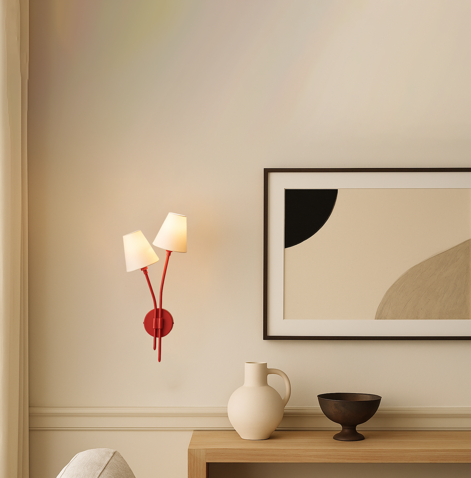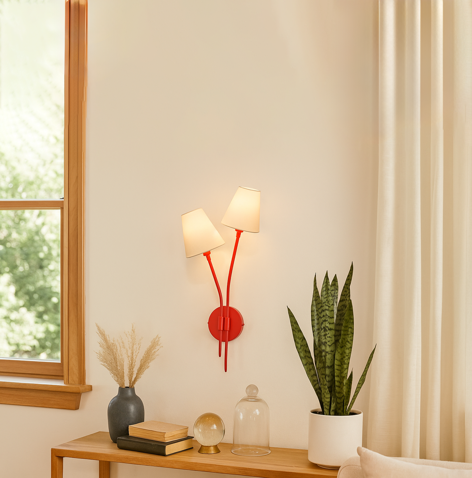 Introducing our exquisite wall lamp, a stunning addition to your home decor. With its sleek red color finish, this lamp exudes a sense of contemporary elegance that will enhance any space. The striking design, reminiscent of a delicate one branch design, adds a touch of nature-inspired beauty to your walls. Its unique shape, gives it a charming and playful aesthetic that will surely catch the eye of your guests.