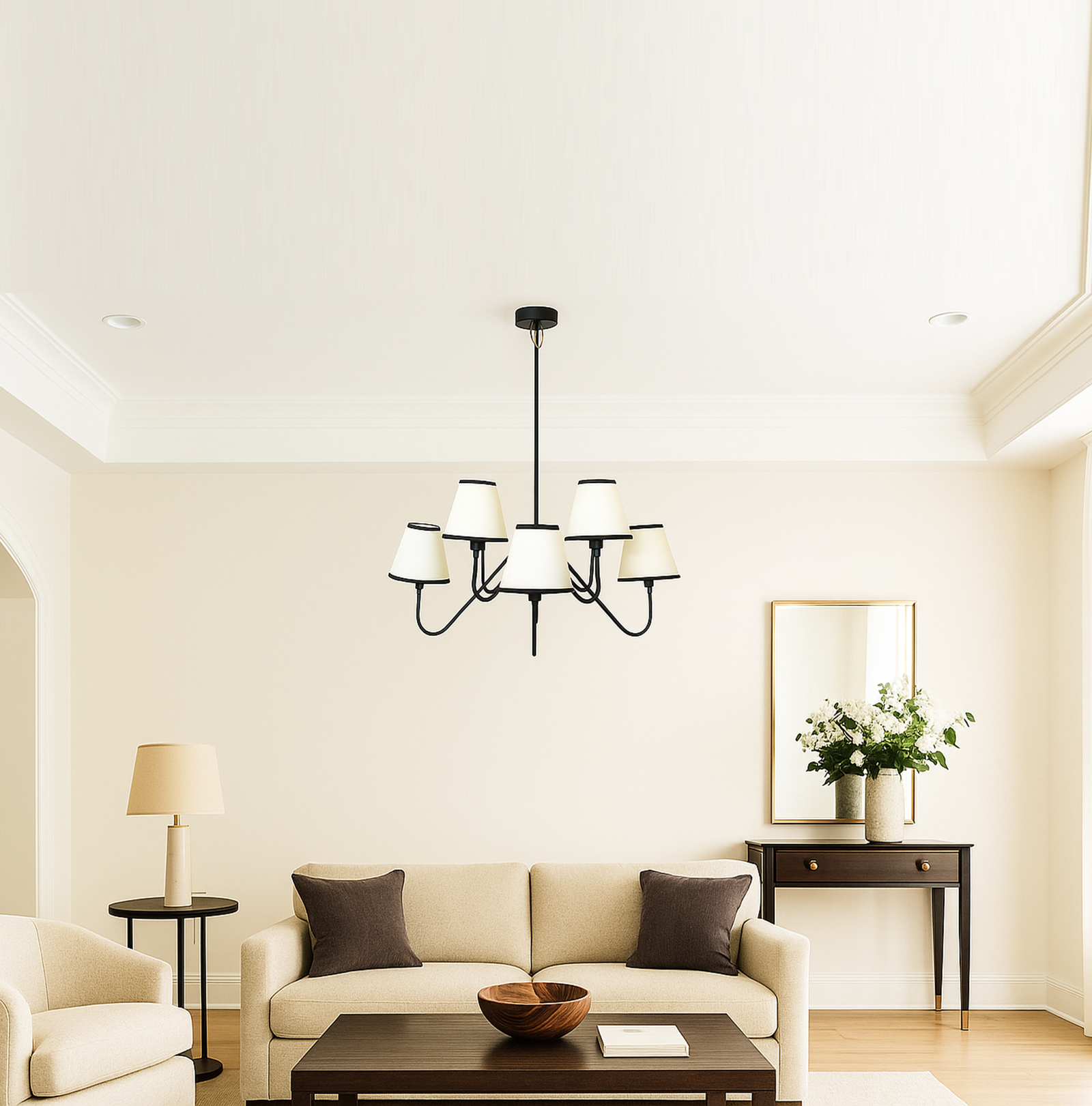 <p><span style="background-color: rgb(244, 245, 246); font-family: Inter, sans-serif, Zen; font-size: 18px; white-space-collapse: preserve-breaks; color: rgb(40, 40, 40);">Illuminate your space with this stunning black chandelier featuring five elegant white shades. The vibrant red finish adds a bold touch to any room, while the soft white shades diffuse light beautifully, creating a warm and inviting atmosphere. Perfect for dining rooms, living areas, or entryways, this chandelier combines modern design with classic charm, making it a versatile addition to your home decor. Elevate your interior style and enjoy the perfect blend of color and light with this exquisite lighting fixture.</span></p>