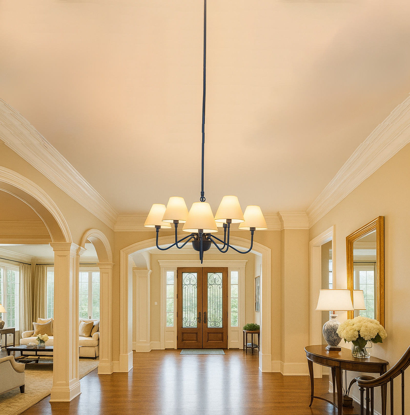 <p><span style="background-color: rgb(244, 245, 246); font-family: Inter, sans-serif, Zen; font-size: 18px; white-space-collapse: preserve-breaks; color: rgb(40, 40, 40);">Illuminate your space with this stunning black chandelier featuring five elegant white shades. The vibrant red finish adds a bold touch to any room, while the soft white shades diffuse light beautifully, creating a warm and inviting atmosphere. Perfect for dining rooms, living areas, or entryways, this chandelier combines modern design with classic charm, making it a versatile addition to your home decor. Elevate your interior style and enjoy the perfect blend of color and light with this exquisite lighting fixture.</span></p>