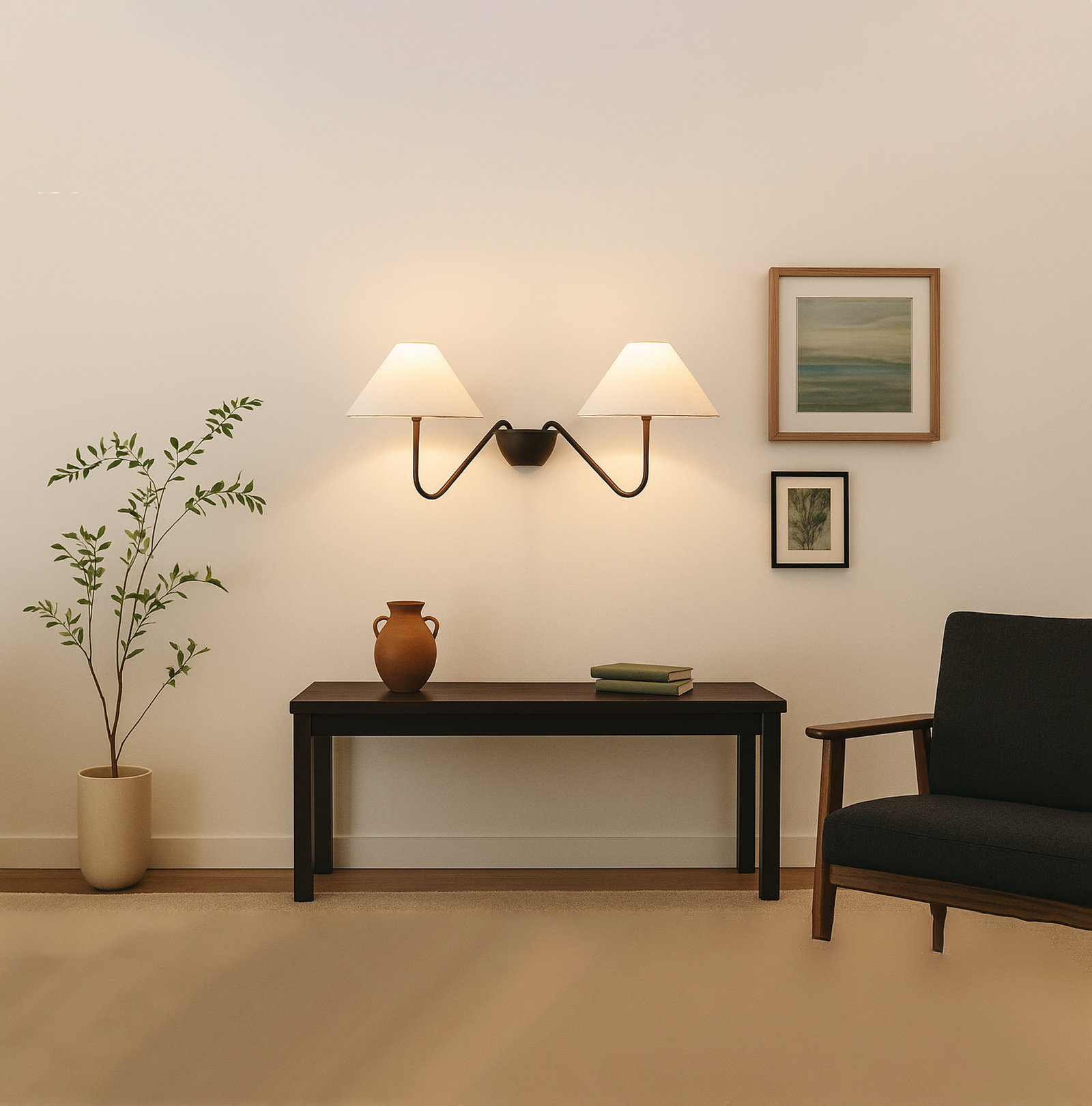 <h3 style="font-weight: normal; line-height: 1.2em; color: rgb(51, 51, 51); font-family: sans-serif, Arial, Verdana, "Trebuchet MS"; background-color: rgb(255, 255, 255);">Introducing our exquisite wall lamp, a stunning addition to your home decor. With its sleek Matte black color finish, this lamp exudes a sense of contemporary elegance that will enhance any space. The striking design, reminiscent of a delicate two branches, adds a touch of nature-inspired beauty to your walls. Its unique shape, gives it a charming and playful aesthetic that will surely catch the eye of your guests.</h3>